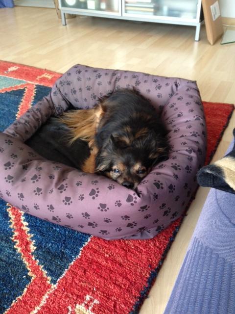 Zwei Stunden habe ich dann Zuhause in meinem Körbchen im Wohnzimmer gut geschlafen, bis ich wieder Schmerzen bekam. Frauchen legte sich dann zu mir neben das Körbchen und hat die ganze Nacht auf mich aufgepasst. Wir sahen uns fast immer in die Augen. Die Schmerzen wurden immer schlimmer. Um fünf Uhr ging sie ins Bad um sich anzuziehen und in die Klinik fahren zu können. Ich wollte aber nicht alleine sein und rief immer wieder. Sie kam zwischendurch immer wieder ins Wohnzimmer, um mich zu beruhigen. Endlich war sie fertig. Sie rief dann im Krankenhaus an um zu sagen, dass wir sofort Hilfe benötigen. Als Hannelore dann wieder aus dem Wohnzimmer ging hatte ich Angst, sie würde mich alleine lassen und schrie so laut ich nur konnte, dabei wollte sie nur eine Jacke anziehen. Sie nahm mich auf den Arm und trug mich zum Auto, da war ich ganz ruhig. Unterwegs erzählte sie mir, dass ich gleich eine Spritze bekäme, die mich müde macht und danach eine zweite, die mich von meinen Schmerzen erlösen, aber auch für immer aus dem Leben dieser Welt holen würde. Der Arzt kam und legte mich auf dem Behandlungstisch und es geschah alles so, wie Frauchen es gesagt hatte. Als ich für immer eingeschlafen war, nahm sie mich wieder auf den Arm und mit nach Hause in mein Körbchen. Es war inzwischen 6:40 Uhr. Sie saß ganz traurig bei mir und streichelte mich, so, als würde ich noch leben. Ihre Traurigkeit macht mir Sorgen. Ich wäre doch auch so gerne noch geblieben, weil es so schön bei uns war, aber mein Körper hat es nicht geschafft. Ich bin inzwischen auf der anderen Seite angekommen und es geht mir hier gut. Nur mein Frauchen kann ich nicht trösten.