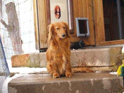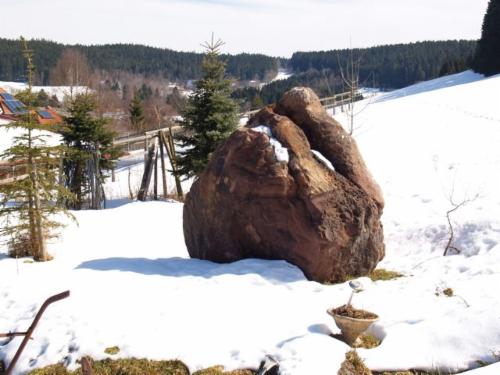 Die Ferienwohnung in Langenschiltach war wirklich toll! Ich habe sie das erste Mal gesehen. Für meine Menschen und mein Rudel war sie nicht neu; sie waren im August 2009 schon einmal dort. Wir haben uns dort sehr wohl gefühlt. Besonders der schöne, große Findling, der am Teich steht, hat es meinen Menschen angetan. Ich habe wohl eher mal eine praktische Verwendung für den Steinriesen. - Wenn man mich nicht bremst; was aber zu befürchten ist.