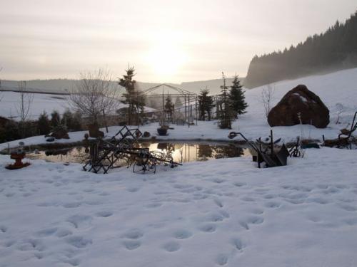 So präsentierte sich das Ensemble - Stein und Teich - beim Sonnenaufgang am Mittwoch, den 17. März; leicht diesig, aber es war ein sehr schöner Moment. Der Schnee war ziemlich fest, so dass man fast ohne einzusinken darauf laufen konnte.
